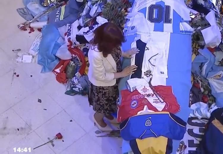 Cristina se abrazó con la ex esposa del mejor futbolista de todos los tiempos y habló brevemente con Dalma y Gianinna. Luego se dirigió al féretro de Diego para depositar allí un rosario sobre la camiseta de Gimnasia y Esgrima de La Plata, club del que la presidenta del Senado es hincha y última institución que dirigió Maradona como entrenador. Allí se quedó contemplando el cajón durante unos minutos.