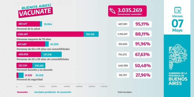 "el primer hito en la vacunación que es que queda cubierto en un 95% el personal de salud y un 90% de los mayores de 70 años". Además destacó que ya se han alcanzado los 3 millones de bonaerenses vacunados con la primera dosis.