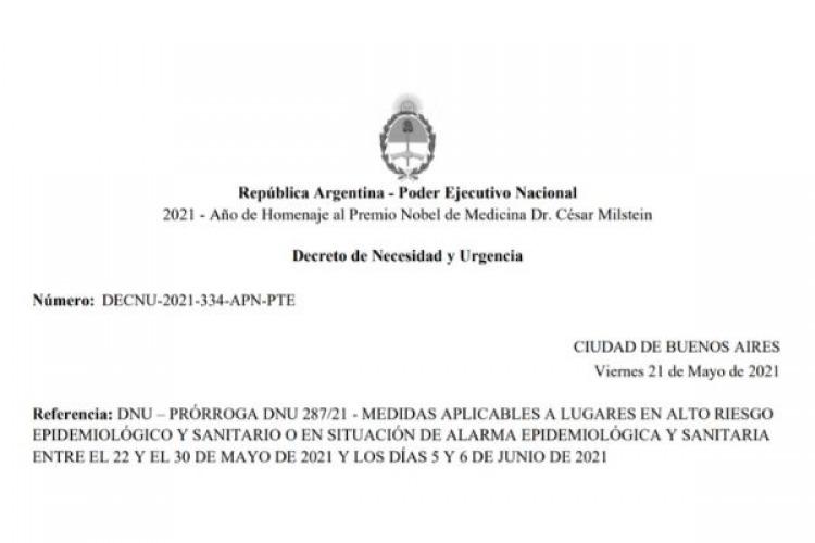 "PRÓRROGA DEL DECRETO DE NECESIDAD Y URGENCIA N° 287/21: Prorrógase el Decreto N° 287/21 y el plazo establecido en su artículo 30, así como sus normas complementarias, hasta el día 11 de junio de 2021 inclusive, en los términos del presente decreto", señala la normativa publicada en el Boletín Oficial.
