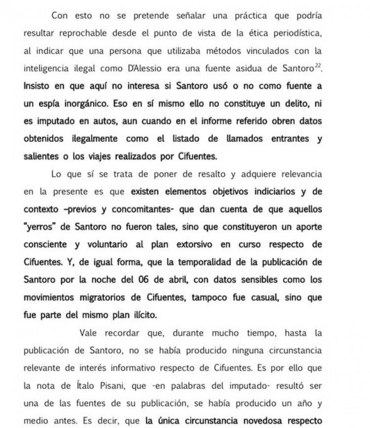 "Aquí no interesa si Santoro usó o no como fuente a un espía inorgánico. Eso en sí mismo no constituye un delito, ni es imputado en autos, aún cuando en el informe referido obren datos obtenidos ilegalmente como el listado de llamados entrantes y salientes o los viajes realizados por Cifuentes", sostiene Bava en el escrito.