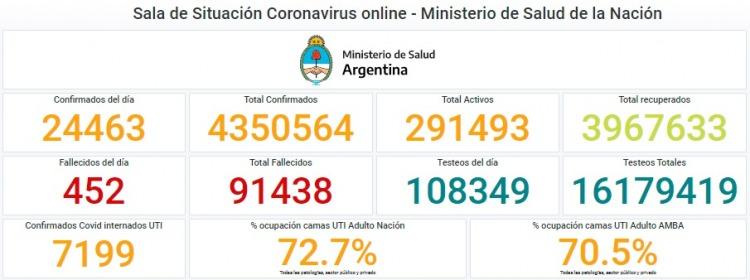Según el Ministerio de Salud de la Nación, este jueves se registraron 24.463 casos positivos sumando así 4.350.564 contagios desde el inicio de la pandemia. En lo que respecta a víctimas fatales, la cantidad de muertos en las últimas 24 horas fue de 452 haciendo que las víctimas fatales por COVID desde el otoño 2020 sean de 91.438.