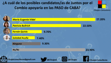 "En un escenario de probable interna durante las PASO, en el primer distrito mencionado (CABA) se impondría María Eugenia Vidal (27,20%) por sobre Patricia Bullrich (22,50%). Algo similar se observa en PBA donde Diego Santilli (28,90%) aventaja a Jorge Macri (16,70%), intendente de Vicente López y hermano del ex presidente", detalla el relevamiento.