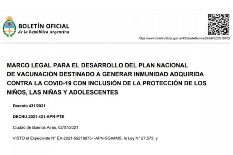 El Gobierno nacional publicó este sábado el nuevo Decreto de Necesidad y Urgencia (DNU) 431 que posibilitará a la Argentina encarar las negociaciones con las farmacéuticas Pfizer, Modera y Janssen por la adquisición de las vacunas pediátricas contra el Covid 19.