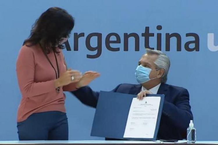 La firma del decreto de promulgación de la Ley 27.636, que lleva por nombre