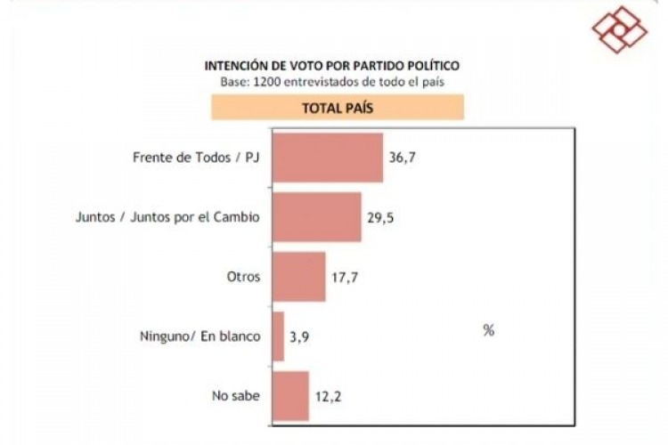 En el análisis de intención de votos a nivel país, el Frente de Todos cosecha una adhesión del 36,5 por ciento, seguido de Junto / Juntos por el Cambio, con 29 por ciento.