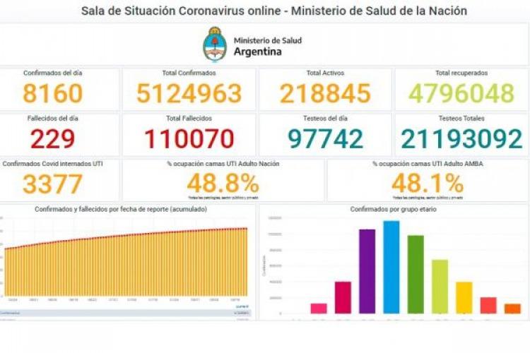 El Ministerio de Salud de la Nación que conduce Carla Vizzotti registró un total de 8.160 nuevos casos y 229 muertos por COVID-19 en la Argentina. Con las cifras registradas este viernes, se alcanzó el total de 5.124.963 infectados y 110.070 fallecidos desde que se inició la pandemia.Cabe señalar que 218.845 personas se encuentran atravesando la enfermedad.