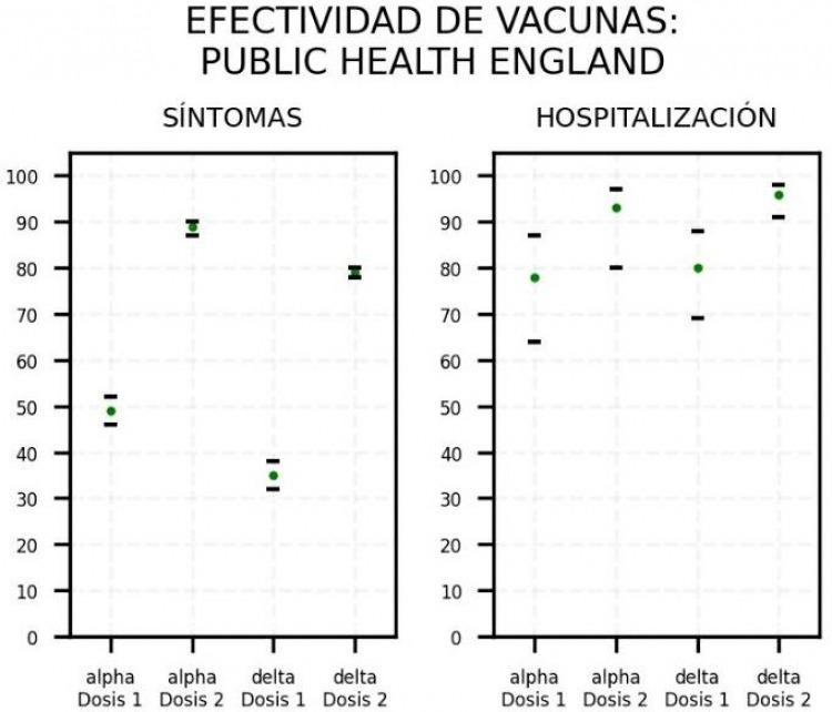 "parte del pánico generado por Delta viene justamente de la pérdida de efectividad". "Hoy hay pocas dudas de que las vacunas pierden efectividad para prevenir infección y enfermedad sintomática contra Delta", afirmaron. Esta pérdida es la que que se observa en el gráfico de la izquierda (abajo).