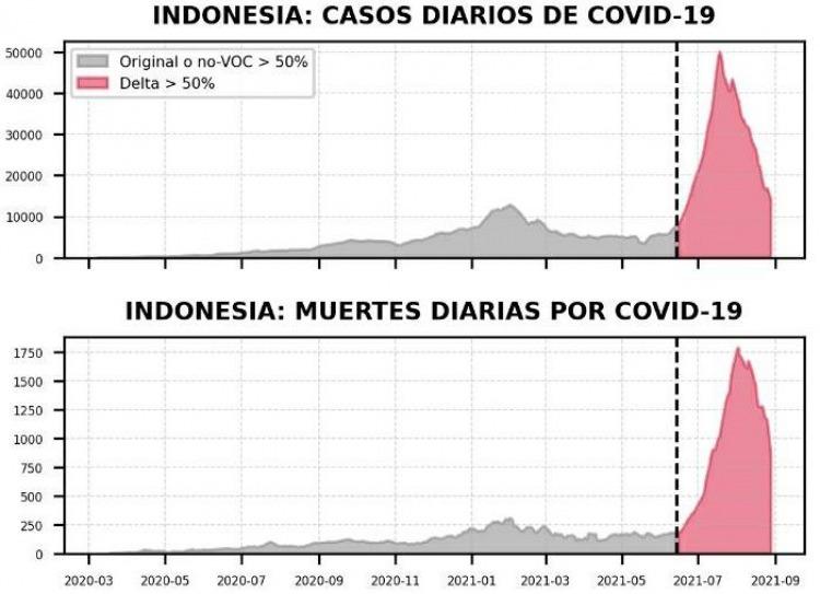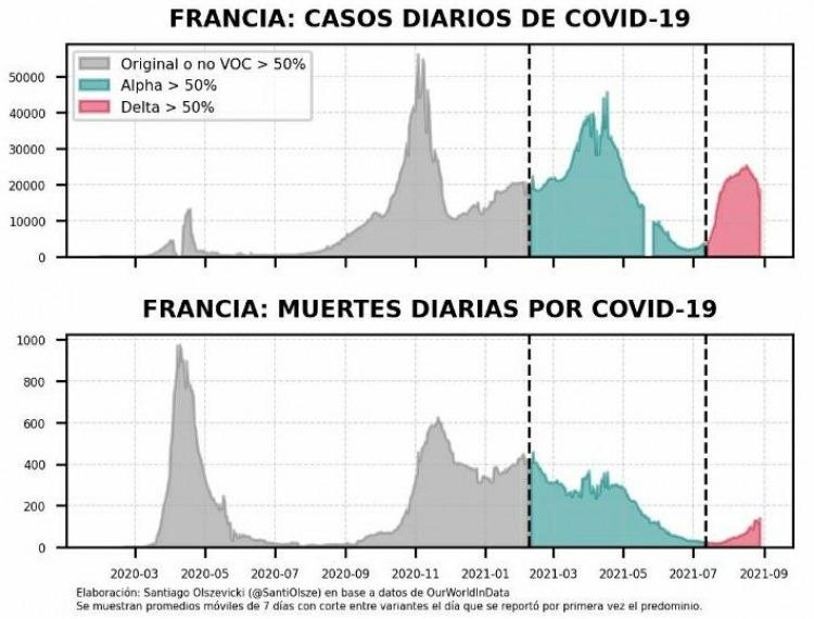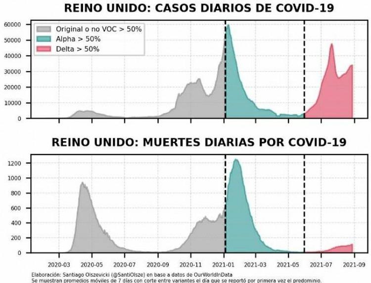 Reino Unido, por ejemplo, Delta es mayoritaria desde finales de mayo. Desde entonces, hubo 4654 muertes, el equivalente a cuatro días de la ola anterior. "En su primera ola, Reino Unido tuvo 41.274 muertos en 180 días (229 promedio por día). Hubo 33.850 en la segunda (156 días, 217 por día), 52.908 en la tercera por Alpha (147 días, 360 por día) y 4.654 en la Delta (90 días, 52 por día). ¿La diferencia? Las vacunas", afirmaron.