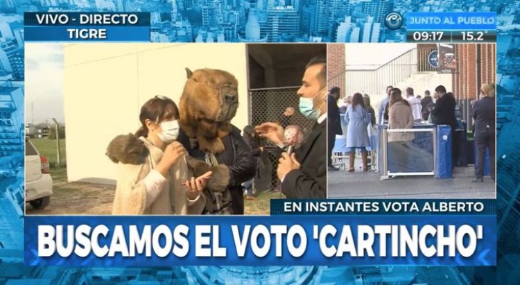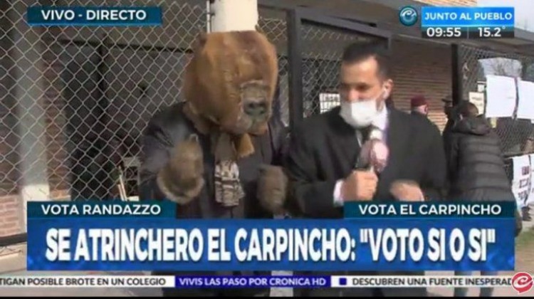 No sólo las elecciones 2021 se destacaron, hasta acá, por los insólitos spots que lanzaron los precandidatos a diputados y senadores, con Florencio Randazzo, la izquiera y Guillermo Moreno al frente, sino que ahora, en pleno comicio, se sumó el hombre carpincho que fue a votar
