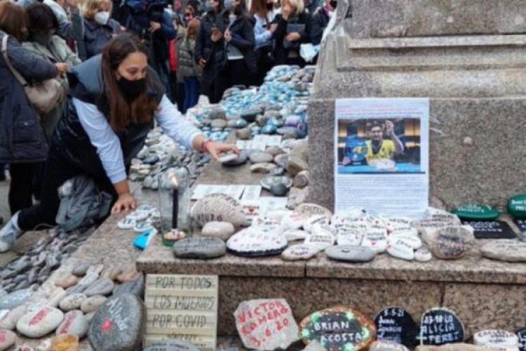 Día de la Lealtad a las afueras de la Casa Rosada, donde manifestantes subieron por el monumento a Manuel Belgrano y quitaron fotos de los ciudadanos que perdieron la vida a causa del Covid-19.