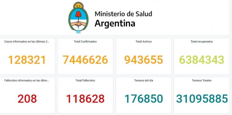 El Ministerio de Salud de la Nación reportó que en las últimas 24 horas fueron registrados 128.321 nuevos contagios de COVID. Lo que suma 7.446.626 positivos desde el inicio de la pandemia.