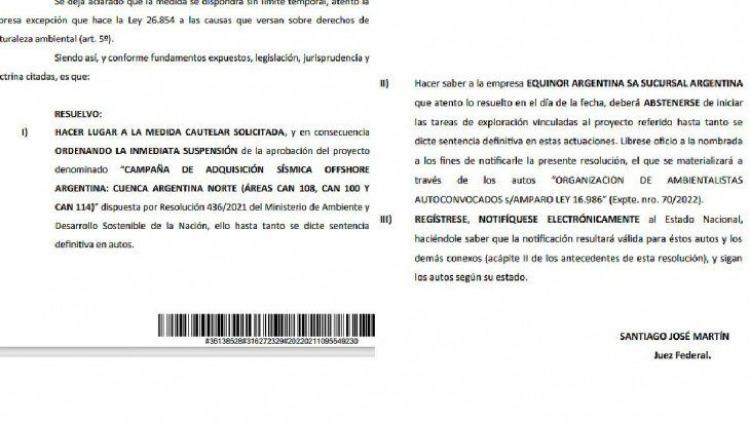 “Campaña de Adquisición Sísmia Offshore Argentina: Cuenca Argentina Norte". Hasta tanto se dicte sentencia definitiva, la empresa Equinor deberá abstenerse de iniciar las tareas de explotación sísmica en Mar del Plata.