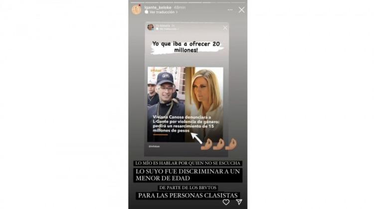 Cipolla, además, compartió en su cuenta de Instagram una nota la cual sostenía que la mediática periodista opositora iba a pedir un resarcimiento de 15 millones de pesos. “Yo que iba a ofrecer 20 millones”, ironizó. L-Gante también la subió en sus stories con un mensaje.