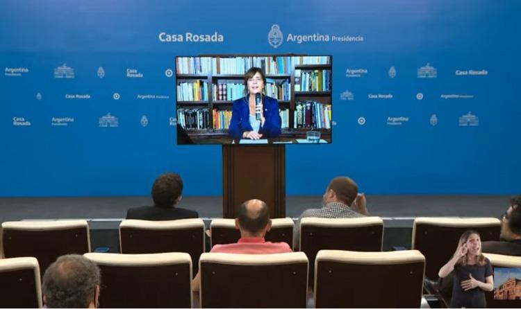 "palabra por palabra" los intereses de la Argentina, en el marco de una conferencia de prensa que ofreció vía zoom desde su domicilio, al estar aislada por dar positivo en coronavirus recientemente.