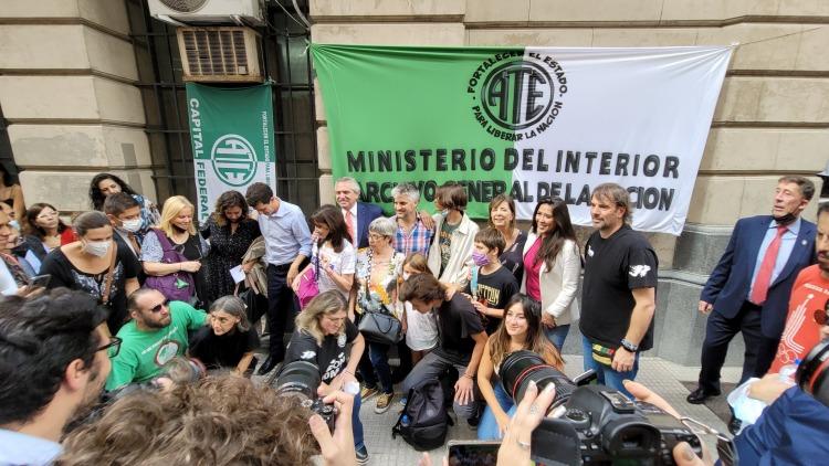 Acompañaron al jefe de Estado y al ministro del Interior durante el homenaje el secretario General de ATE Capital, Daniel Catalano; la secretaria General de ATE de la cartera de Interior, Soledad Santellan; y familiares y amigos de los dos trabajadores detenidos desaparecidos.