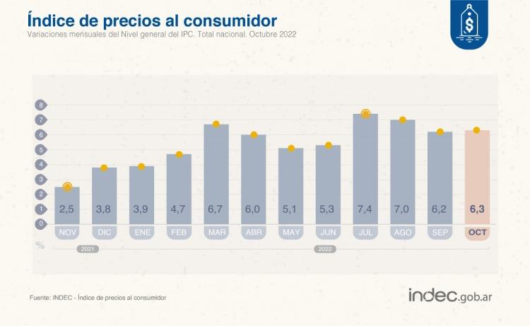 La inflación se aceleró levemente en octubre, percibió un incremento del 6,3% respecto a septiembre y rompió con los dos meses consecutivos de desaceleración. En los primeros diez meses del año, el incremento general de precios fue del 76,6%. Mientras que la medición interanual de precios minoristas reflejó un incremento del 88%, de acuerdo al último informe del Instituto Nacional de Estadística y Censos (INDEC).