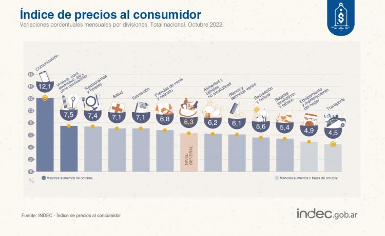 La división Comunicación (12,1%) fue la de mayor aumento en el mes, principalmente por la suba de los servicios de telefonía e internet, seguida por Vivienda, agua, electricidad, gas y otros combustibles (7,5%), donde se destacó el incremento de los servicios de electricidad y gas por la segmentación tarifaria.