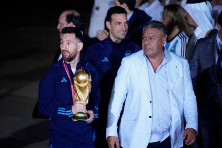 Al arribar, los jugadores fueron recibidos por la interpretación en vivo, a cargo del grupo musical La Mosca, del tema que se convirtió en himno de los hinchas albicelestes en el Mundial. "Muchachos, ahora nos volvimos a ilusionar", acompañó el descenso de los futbolistas y del cuerpo técnico, que estuvieron encabezados por