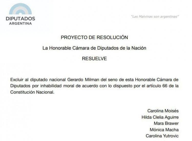 "Los hechos relatados, lejos de ser exhaustivos y muchos de los cuales se encuentran actualmente en investigación en sede judicial para determinar si constituyen actos criminales, sin duda tiñen de inmoralidad a quien debería representar los intereses de la Nación Argentina. Su presencia en este cuerpo lo degrada y lo devalúa. Es por esto que solicitamos a nuestros pares acompañar el presente proyecto de resolución", completa el documento.