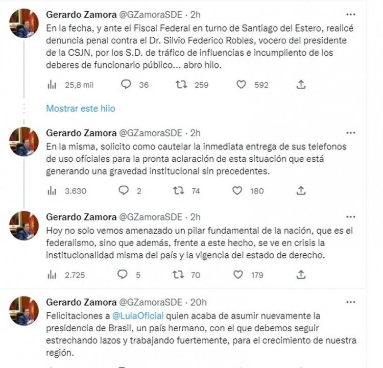 "En la fecha, y ante el Fiscal Federal en turno de Santiago del Estero, realicé denuncia penal contra el Dr. Silvio Federico Robles, vocero del presidente de la CSJN, por los S.D. de tráfico de influencias e incumplimiento de los deberes de funcionario público", escribió el mandatario provincial en un hilo de Twitter.