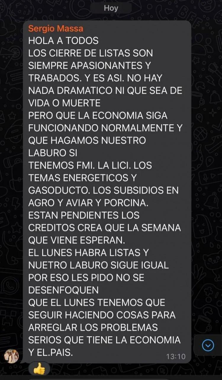 Con respecto al mensaje de Massa que se difundió en distintos medios, Massa recalcó en el texto: “El lunes tenemos que seguir haciendo cosas para arreglar los problemas serios que tiene la economía y el país”.