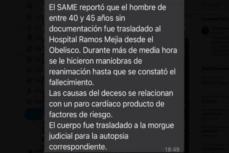 Volviendo al comunicado del SAME, que fue difundido brevemente, se señaló que el hombre, cuya edad se estimó entre 40 y 45 años y quien no portaba documentación, que fue trasladado al Hospital Ramos Mejía desde la zona del Obelisco, donde se desarrollaba una manifestación.