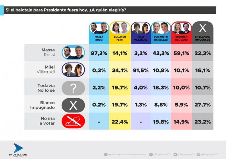 Según el 15 por ciento de la fórmula de Juntos por el Cambio (JxC) se van con Massa-Rossi; un poco mas, 24 por ciento se van con Milei, pero más de la mitad dicen que no saben (22 por ciento), que votarán en blanco (19 por ciento) y que no irán a votar (22 por ciento). Según estudios anteriores, Milei necesitaría para ganar el 80 por ciento de los votos de Bullrich.