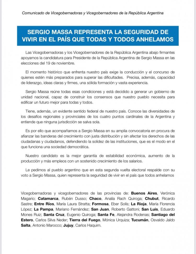 Sobre el final del texto enviaron un mensaje "al pueblo argentino" para que "esta segunda vuelta electoral respalde con su voto a Sergio Massa, quien representa la seguridad de vivir en el país que todos anhelamos".