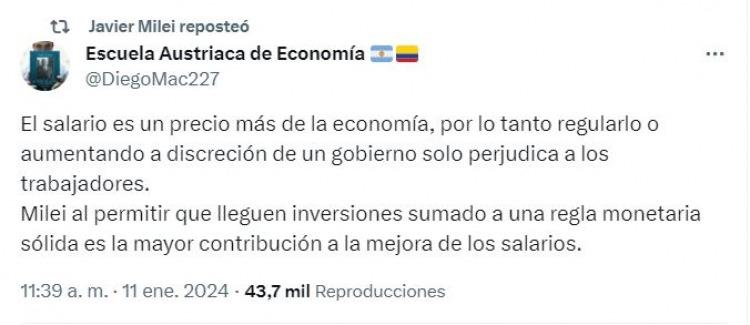"El salario es un precio más de la economía, por lo tanto regularlo o aumentarlo a discreción de un gobierno solo perjudica a los trabajadores", empieza el tuit de la cuenta @DiegoMac227 (con nombre "Escuela Austríaca de Economía"), que el jefe de Estado compartió desde su cuenta oficial.