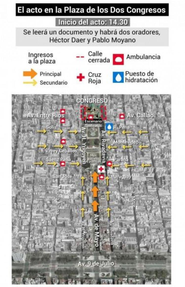 De hecho, por Avenida de Mayo será el ingreso principal de los manifestantes que se dirigirán hacia el Congreso. Además se organizó que haya ingresos secundarios: estos serán por las avenidas Hipólito Yrigoyen y Rivadavia; y las calles Sáenz Peña, Paraná, Virrey Ceballos, Montevideo, Solís y R. Peña. Además habrá ambulancias ubicadas en las avenidas Entre Ríos y Callao.