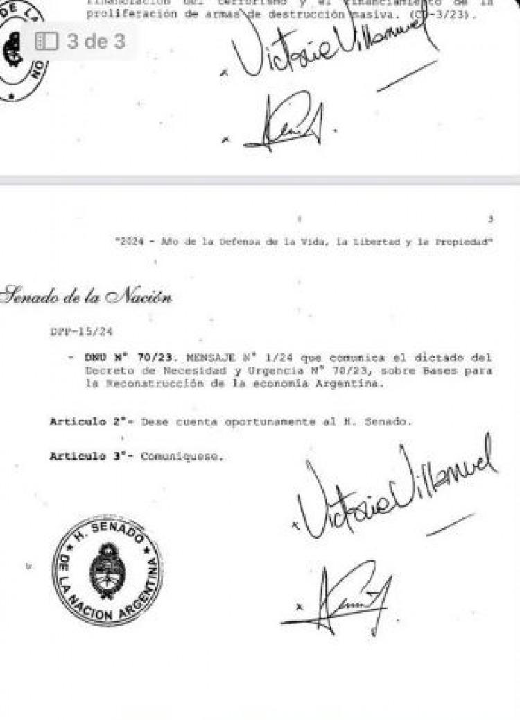 Así las cosas, si el Senado lo rechaza, el DNU de todas maneras seguirá vigente, ya que sólo cae si lo votan negativamente las dos cámaras, en sendos recintos.