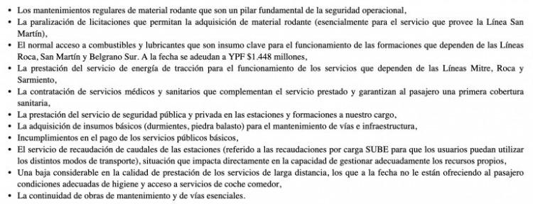 parálisis del mantenimiento regular del material rodante, la paralización de licitaciones para adquirir o recuperar material rodante –incluyendo la reparación de locomotoras para la línea San Martín–, el acceso al combustible y al pago de gastos de electricidad para los distintos servicios, la adquisición de insumos básicos para el mantenimiento de vías, la contratación de servicios médicos de atención a los pasajeros y de servicios de seguridad en trenes y estaciones, entre otros. La nota incluso resalta que, para esa fecha, se encontraba en riesgo por falta de pago la continuidad de los controles de alcoholemia que regularmente se realizan a los conductores de trenes.