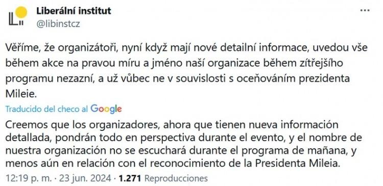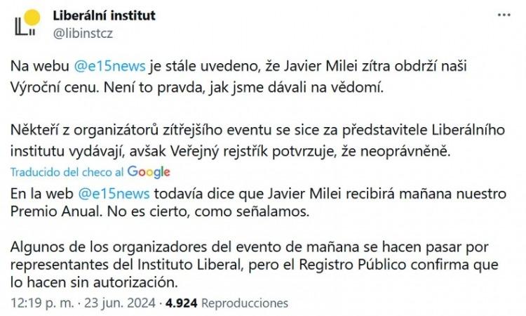 "este mensaje está siendo difundido en nuestro nombre sin autorización por personas que no han participado en las actividades del Instituto Liberal durante varios años, no tienen ningún cargo en el Instituto y no tienen derecho a hablar en su nombre". "No es cierto que Javier Milei reciba nuestro premio anual", explicaron en redes sociales, y remarcaron que "algunos de los organizadores del evento se hacen pasar por representantes del instituto".
