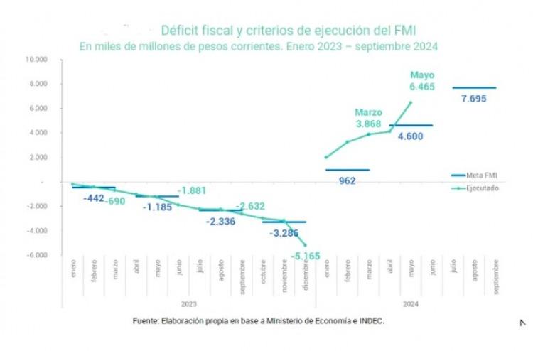 el Instituto Argentino de Análisis Fiscal (IARAF) estimó que el ajuste fiscal ejecutado hasta mayo equivalió al 5,8% del Producto Bruto Interno (PBI) anualizado. Este nivel de ajuste supera lo necesario para alcanzar un déficit cero en 2024, con un excedente estimado de 1,4 puntos del PBI según las proyecciones actuales.
