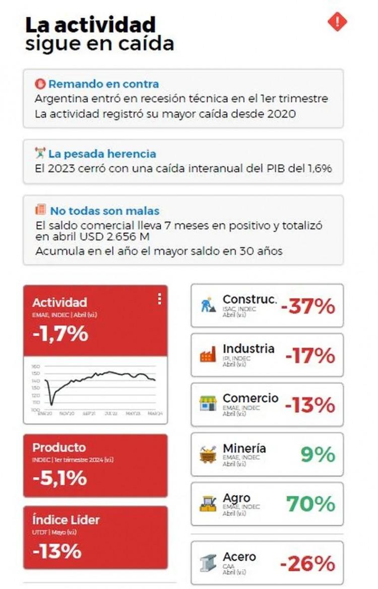 La fundación de Mauricio Macri advierte con preocupación los datos que refieren a la baja en la actividad económica durante la gestión de Javier Milei. Detalla la caída en la construcción (-37%), industria (-17%), comercio (-13%), acero (-26%), autos (-21%) y textil (-19%), aunque destaca la suba en el agro (+70%) y minería (+9%), entre otros.
