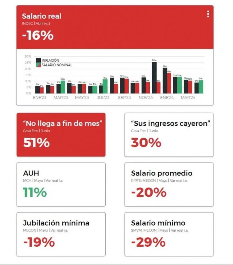 En otra parte del informe, se afirma que en los últimos seis meses "los ingresos aún no logran ganarle a la inflación" y las jubilación mínima (con bono) "se encuentra a la par de la línea de pobreza", para luego reflotar el dato del Indec del mes de abril que refleja una caída del salario real en un 16%.