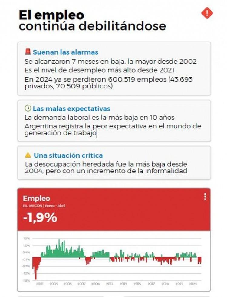 "Se alcanzaron 7 meses en baja, la mayor desde 2002. Es el nivel de desempleo más alto desde 2021 y en 2024, ya se perdieron 600.519 empleos (43.693 privados, 70.509 públicos)", advierten desde Fundación Pensar.