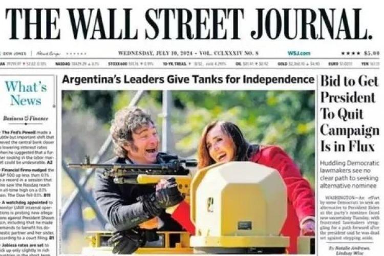 El diario norteamericano The Wall Street Journal publicó en su portada una foto del presidente Javier Milei y la vicepresidenta Victoria Villarruel subidos a un tanque militar, una imagen que fue capturada el martes durante el desfile realizado en la Ciudad de Buenos Aires en el marco de los festejos por el Día de la Independencia.