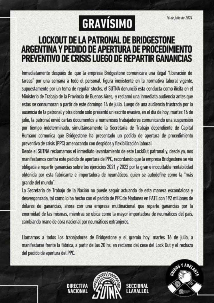 Desde Sutna reclamaron "el inmediato levantamiento de este Lock Out patronal" y se manifestaron "en contra este pedido de apertura de PPC, recordando que la empresa Bridgestone se vio obligada a repartir ganancias sobre los ejercicios 2021 y 2022 por la gran e inocultable rentabilidad obtenida por esta fabricante e importador de neumáticos”.