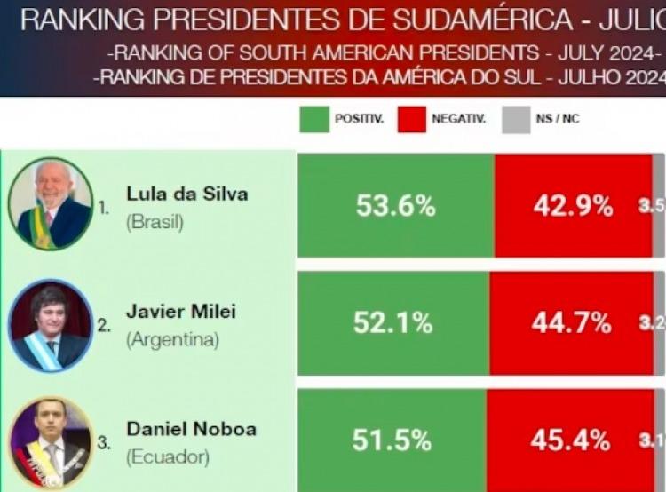 El presidente brasileño Lula da Silva ha desplazado a Javier Milei del primer lugar en el ranking de presidentes sudamericanos elaborado por la consultora CB. Este ranking, que compara la imagen de diez mandatarios de la región, coloca a Lula ahora como el líder con un 53,6% de imagen positiva, mientras que Milei baja al segundo lugar con un 52,1%.