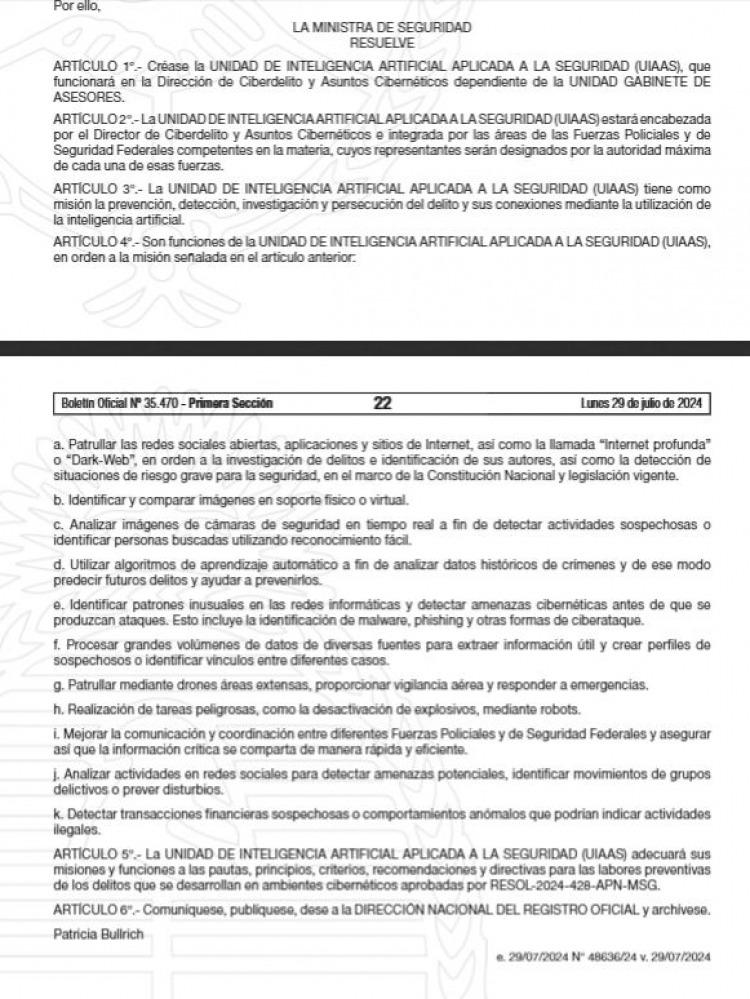 el presidente Javier Milei le firmó un regalo a Patricia Bullrich, ya que el Gobierno Nacional creó por decreto la Unidad de Inteligencia Artificial Aplicada a la Seguridad (UIAAS), un nuevo ente estatal en la órbita del Ministerio de Seguridad que tiene como principal objetivo “mejorar la prevención, detección, investigación y persecución de ciberdelitos, utilizando tecnología de inteligencia artificial (IA)”, incluido el "patrullaje" de redes sociale.