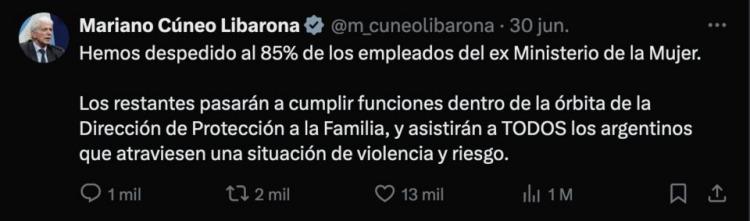 De hecho, Mariano Cúneo Libarona, titular de la cartera de Justicia, ratificó ese número a tráves de una publicación en redes sociales el 30 de junio.