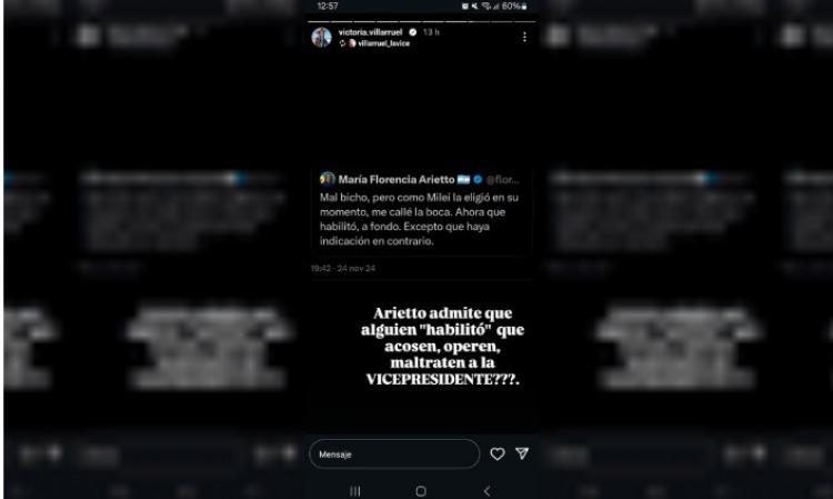 Arietto utilizó sus redes sociales para lanzar una polémica declaración: “Mal bicho, pero como Milei la eligió en su momento, me callé la boca. Ahora que habilitó, a fondo”. Estas palabras generaron una fuerte reacción en los seguidores de Villarruel, quienes interpretaron que la senadora admitía recibir directrices para criticar a la vicepresidenta. “¿Libertad u obediencia al estilo kirchnerista?”, ironizó un usuario, mientras otro destacó: “Confiesa que ataca a Victoria porque recibió la ‘habilitación’ para hacerlo”. Ambos comentarios fueron compartidos por Villarruel en sus historias de Instagram, sin emitir respuestas directas.