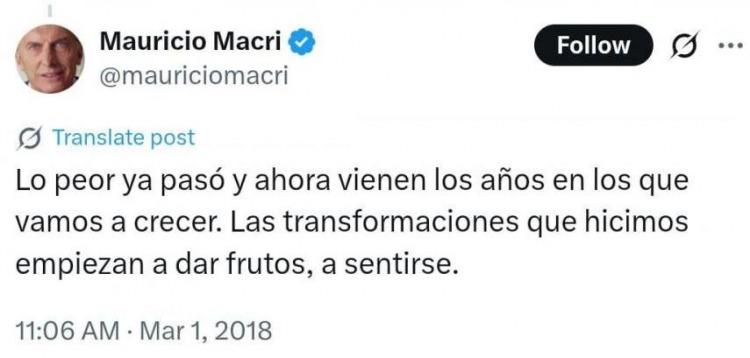 En 2018, Macri eligió inmortalizar su afirmación en sus redes sociales. Este lunes, tras la cadena nacional de Milei, la captura de aquel tuit no tardó en viralizarse y fue reproducida por numerosos usuarios, entre ellos la intendenta de Quilmes Mayra Mendoza. "Lo peor ya pasó y ahora vienen los años en que vamos a crecer", aseguraba Macri. De igual manera, prometió Milei desde que asumió su gestión y tal como ocurrió en ese entonces, las soluciones prometidas y la lluvia de inversiones jamás llegaron.