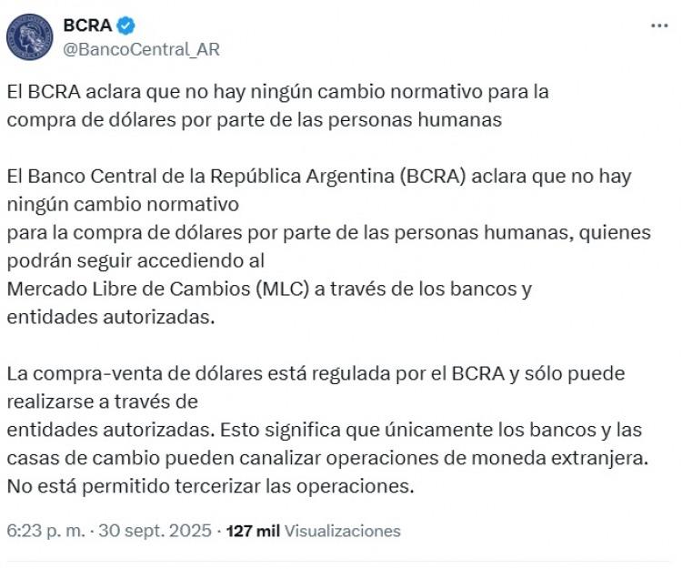 En paralelo, desde el BCRA recordaron que “no está permitido tercerizar las operaciones de cambio” y que solo bancos y casas de cambio pueden vender dólares oficiales. Mientras tanto, las fintech aclararon que seguirán operando con dólar MEP, aunque debieron suspender la operatoria del tipo de cambio oficial. “Nos pidieron apagar”, reconoció en redes Ariel Sbdar, CEO de Cocos Capital.