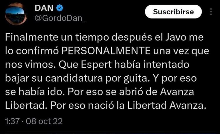 Finalmente, en medio de los cuestionamientos, que hoy cobran otro significado en medio del escándalo que envuelve a Espert, el Gordo Dan criticaba a quienes defendieron la “unidad del liberalismo” y atacaron a los sectores que se oponían a Espert. “Pero ustedes abogaban por la ‘unión del liberalismo’ y nos cagaban a puteadas. Yo no me olvido”, concluyó.