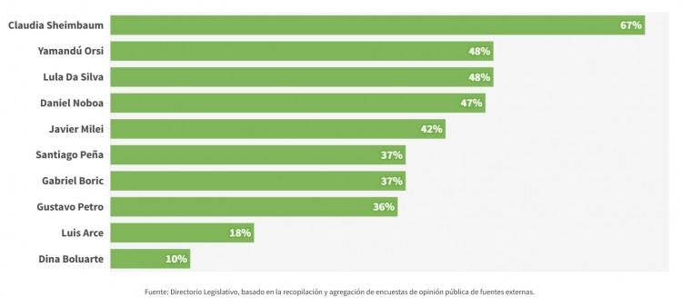 En la región, Claudia Sheimbaum lidera la lista de imagen presidencial con un 67% de aprobación, seguida por Yamandú Orsi y Lula Da Silva, ambos con un 48%, mientras que Daniel Noboa alcanza un 47% y el mandatario argentino, quedó en quinto puesto. “Dentro de este panorama, Javier Milei y Gabriel Boric presentan signos de desgaste presidencial en contextos electorales”, indica el informe.