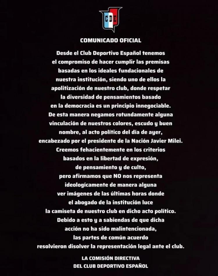 Además, Español agregó: "Negamos rotundamente alguna vinculación de nuestros colores, escudo y buen nombre, al acto político del día de ayer, encabezado por el presidente de la Nación Javier Milei". "Afirmamos que NO nos representa ideológicamente de manera alguna ver imágenes de las últimas horas donde el abogado de la institución luce la camiseta de nuestro club en dicho acto político. Tomamos el compromiso como institución de accionar las medidas pertinentes en el tema", cerró.