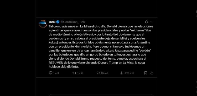En un intento por contener el daño político del mensaje de Donald Trump, el referente libertario “Gordo Dan” publicó un extenso descargo en X donde atribuye a una confusión del ex presidente de Estados Unidos la frase con la que condiciona la relación bilateral a un eventual triunfo opositor. El vocero informal del mileísmo se encarga de traducir la amenaza y responsabiliza al canciller por no “escuchar” a tiempo las señales del trumpismo.