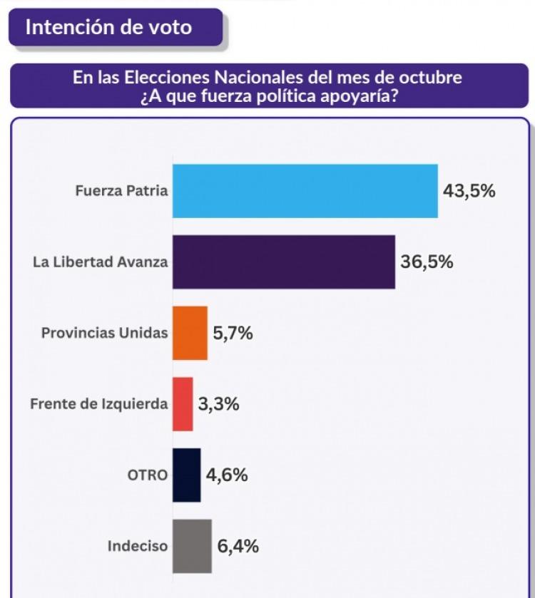 Zentrix registró una ventaja de siete puntos para Fuerza Patria (43,5%) sobre La Libertad Avanza (36,5%), seguida por Provincias Unidas (5,7%) y el Frente de Izquierda (3,3%). Con un 6,4% de indecisos, el escenario anticipa un comicio donde el humor económico y la desconfianza hacia la gestión presidencial serán factores decisivos.